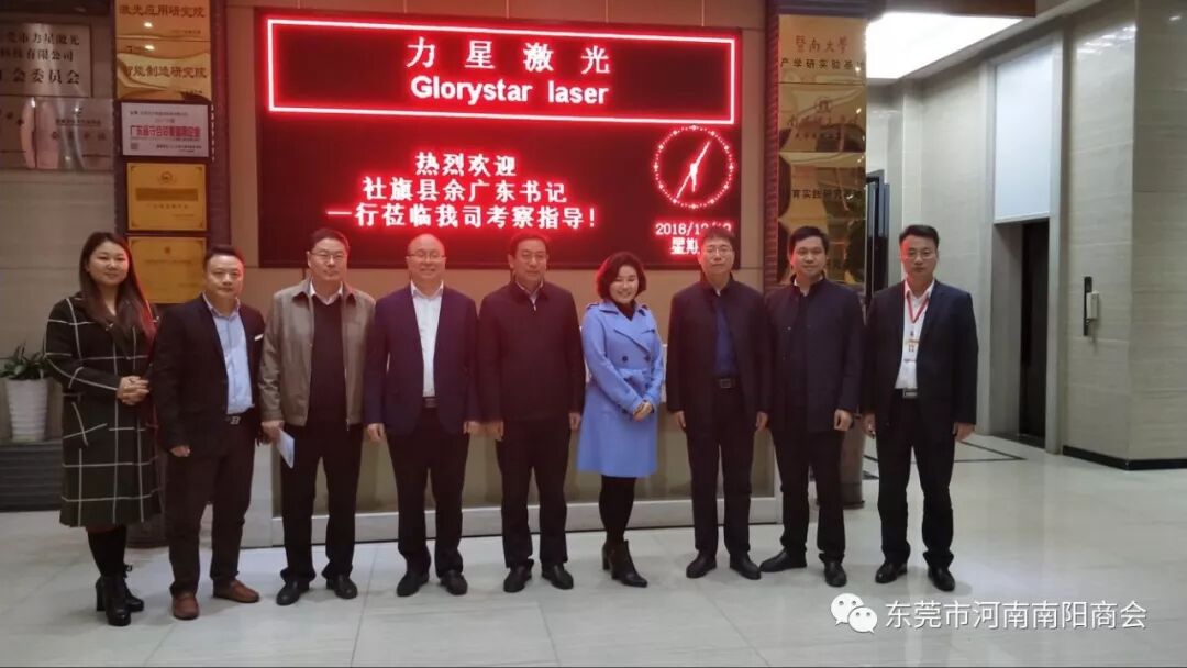 12月10日下午,由社旗县委余广东书记带队,甘泉涛副县长、招商局张东晓局长、桥头镇委崔荣克书记一行来到东莞市南阳商会荣誉会长单位力星激光考察签约, 我会“力星激光”姚玉东董事长(荣誉会长)、贡东欢主任、赵桂军秘书长、李娟等秘书处人员一同接待。