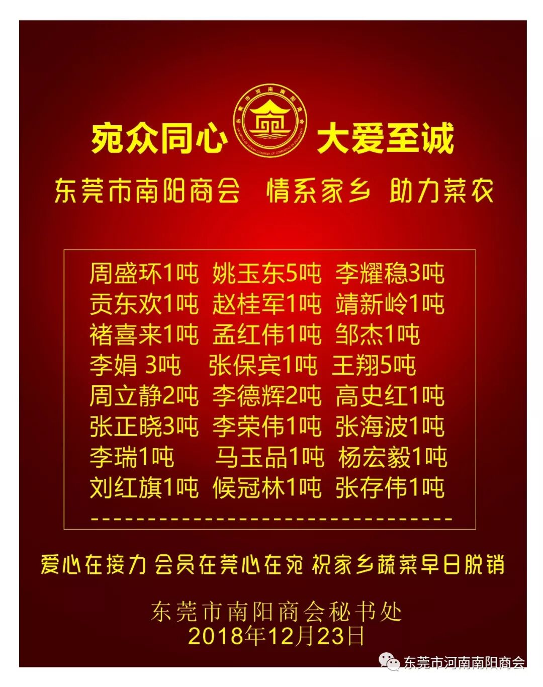 2019-8-22 11:23:33 发布者:东莞河南南阳商会12月23日,东莞市南阳商会秘书处了解到家乡蔬菜滞销,菜农虽然丰收但受市场环境影响,销路无门。对于家乡菜农的困境,远在东莞的南阳商会会员们感同身受,商会当即临时召开紧急会议,筹委会贡东欢主任,赵桂军秘书长号召大家积极认购,张华老师热心组织,在商会内部展开了爱心菜认购接龙,在短短的12个小时内就完成订购一车满33吨的菜,达到整车运输标准。商会老大哥们带头认购,周盛环荣誉会长,姚玉东名誉会长纷纷给予支持。各会员积极响应,后续订购还在不断进行中。